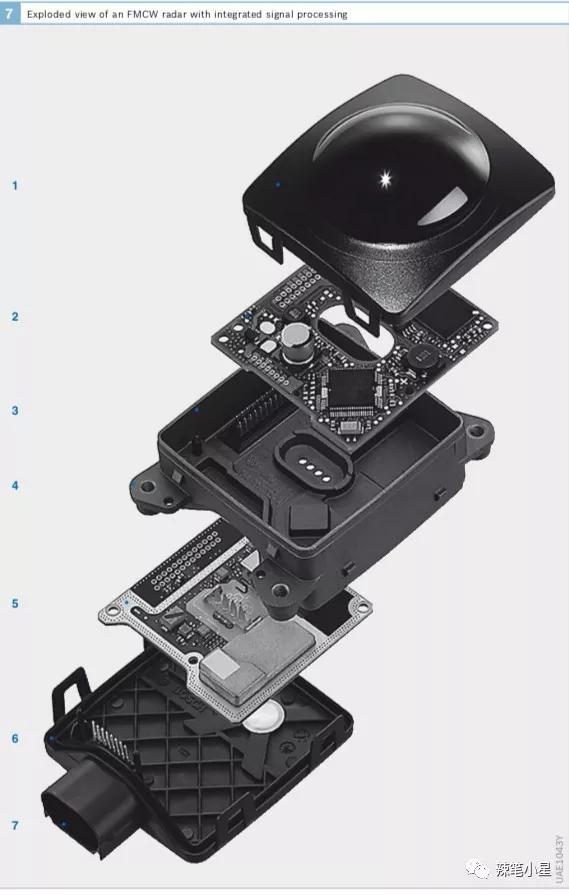 由博世雷达传感器细节可能看到内部采用了众层构造。从上到下按次为带镜头的上盖、高频电道板、带瞄准机构的支架、中心承载层、低频电道板、外壳和连绵器。