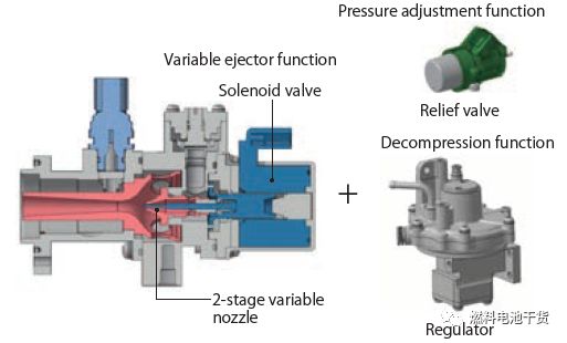 本田2009款燃料电池汽车上,电堆入口侧氢气的压力和流量通过影射器、安排器安静阀(regulator relief valve)竣工。Clarity燃料电池汽车转而应用两个喷射器来无误限度压力和流量,竣工氢气供应体系体积节减40%。
