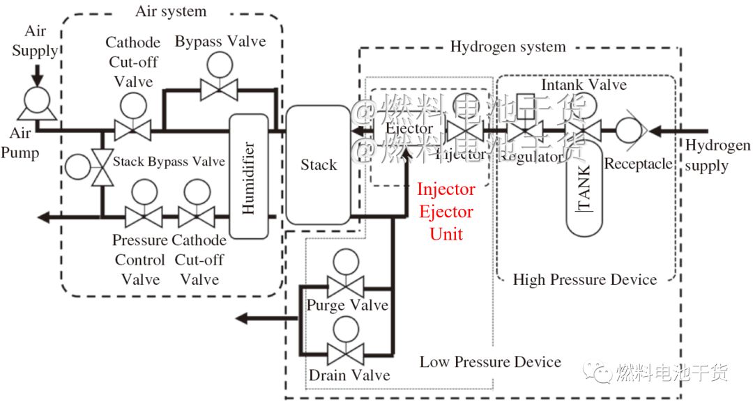 导读:车用燃料电池体系平常由气氛供应体系、氢气供应体系、热执掌体系、限度体系和电堆构成。个中,广义上的车用氢气供应体系由氢气加注口(hydrogen filling port)、氢瓶、氢气管途、氢气喷射器、引射器、氢出阀、氢进阀和氢轮回泵等构成,如下图血色局部所示。狭义上,车用燃料电池体系的氢气供应体系则首要由氢气轮回泵(recirculation pump)、氢气喷射器(injector)、引射器(ejector)、氢进阀、氢出阀等构成或局部构成(不作出格声明,本文指狭义界说)。