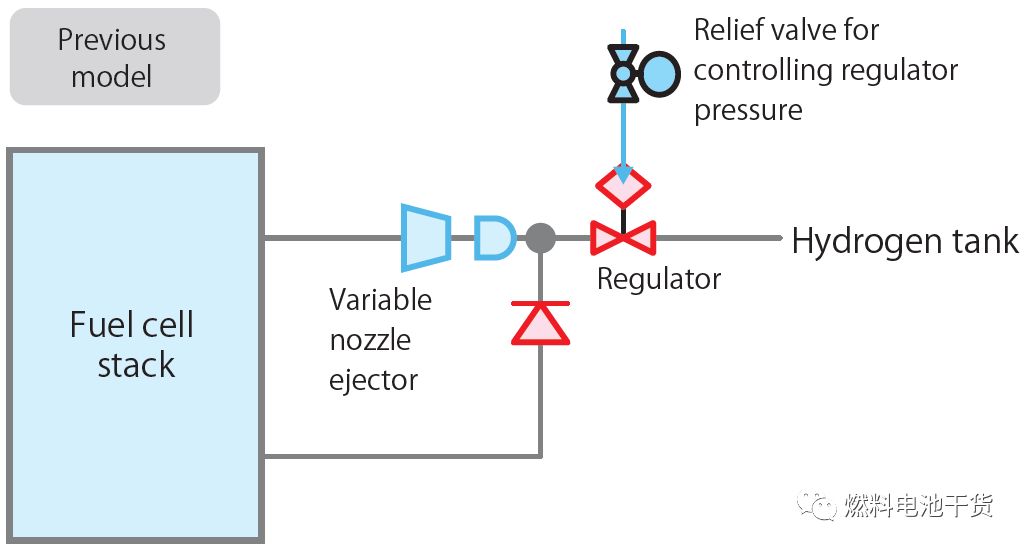 如下图所示,本田上一代燃料电池汽车氢气供应体系搜罗泄压阀(decompression valve)、减压阀(安排泄压阀压力用)、两级可变喷嘴(限度氢气再轮回用)、电磁阀(可变限度用)。