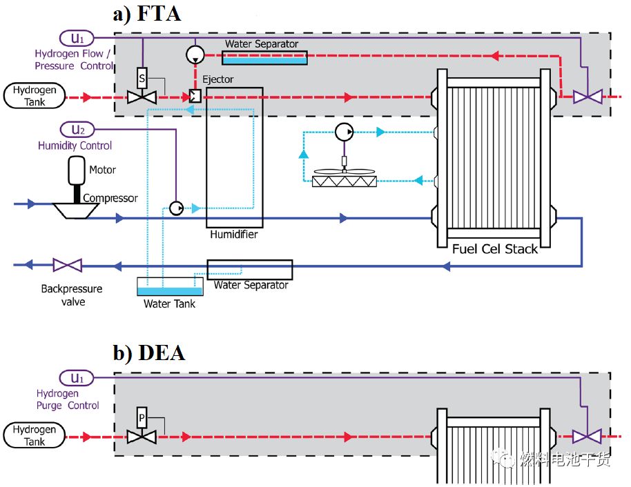 为了抬高燃料诈骗率、确保氢安静(氢气溢出正在外界处境中惹起担心全要素)、改良水执掌和抬高电堆输出职能,大凡对燃料电池堆阳极氢气实行闭端操作。闭端操作有DEA(Dead End Anode)和FTA(Flow Through Anode)两种形式。DEA形式中,大凡正在电堆阳极出口装置常闭电磁阀。因为阳极出口处于常闭形态,阳极出口氢胸怀排出较少,阳极压力较高,氢气诈骗率高。防卫该种形式易惹起阳极“水淹”(窒碍气体通道,影响反响气传质,职能消重)。FTA形式的总体思绪是将没有参加电化学反响的众余氢气再次回送到电堆阳极入口反复应用,同时加湿电堆入口吻体,改良气体分散。必要防卫,轮回经过中,阳极气体中的杂质、阴极气氛中的氮气和水分会正在阳极度累积,长岁月运转易变成阳极反响气分压低落,职能消重,急急乃至惹起反极景象。以是,氢气供应体系的策画至合要紧。