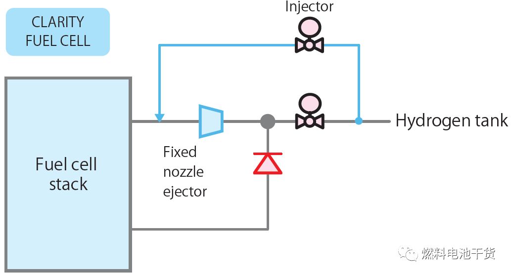 Clarity燃料电池汽车氢气供应体系的泄压、压力调解和氢气再轮回都是通过喷射器来竣工。氢气供应体系没有安排阀、减压阀和可变喷嘴。