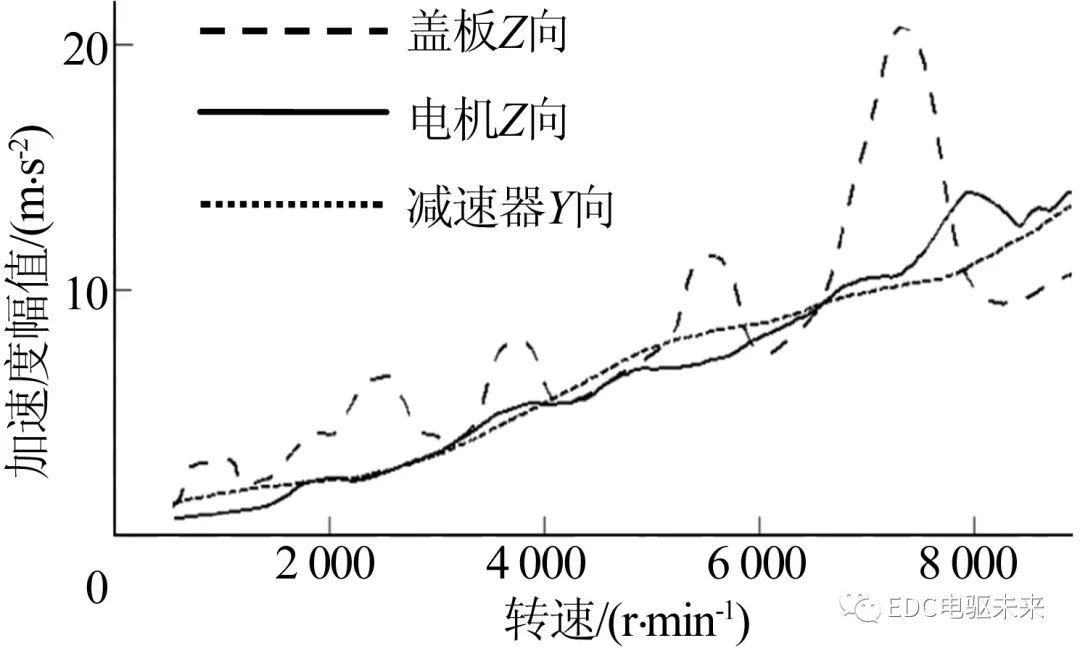 盖板的Z向振动加快率全体上大于电机壳体和减速器的振动加快率,而且正在转速7 330、5 550、3 770 r/min处存正在3个峰值,这3个速率点均位于共振带中噪声幅值较大的速率段内,此时盖板振动所辐射的噪声为驱动编制处事时噪声的闭键孝敬量。振动噪声判辨常采用“源旅途采纳者”的模子举行判辨,三合一电驱动编制因为布局紧凑、转达旅途粗略,从“源”与“采纳者”(电机饱励与限度器盖板)举行优化愈加高效牢靠。