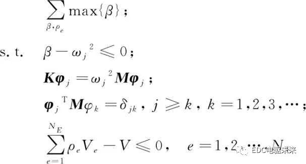 此中:j=1,2,3,…;β为标量因子,用于抑制每阶固有频率的平方均小于β;ρe为单位质料的相对密度,其数值为0~1;NE为单位总数;特质值λj=ωj2为布局第j阶固有频率的平方,满意布局振动的广义特质值方程、即抑制中第1式;φj为第j阶振型模态,满意闭于布局质料矩阵M的正交归一化条目,即抑制中第2式。