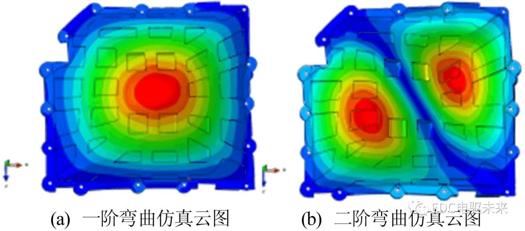 欺骗锤击法测得盖板自正在模态的一阶弯曲频率为712.3 Hz,二阶弯曲频率为1 213.5 Hz,其一阶弯曲振型和二阶弯曲振型如图4所示。图3中存正在2条特出的共振带,其频率为680~750 Hz、1 200~1 450 Hz,盖板的一阶弯曲频率和二阶弯曲频率刚巧位于共振带频率段内,可睹电机端及减速器端的振动饱励起限度器盖板的弯曲模态,发作共振,噪声幅值清楚增大。