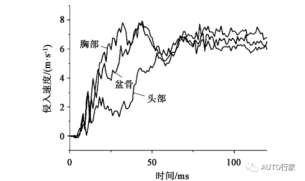 对B 柱上对应于乘员头部( 节点277696) 、胸部( 节点275974) 和盆骨( 节点276345) 的3 个丈量点举行侵入速率的取样。取样节点正在B 柱构造中的职位如图4 所示,计较结果如图5 所示。