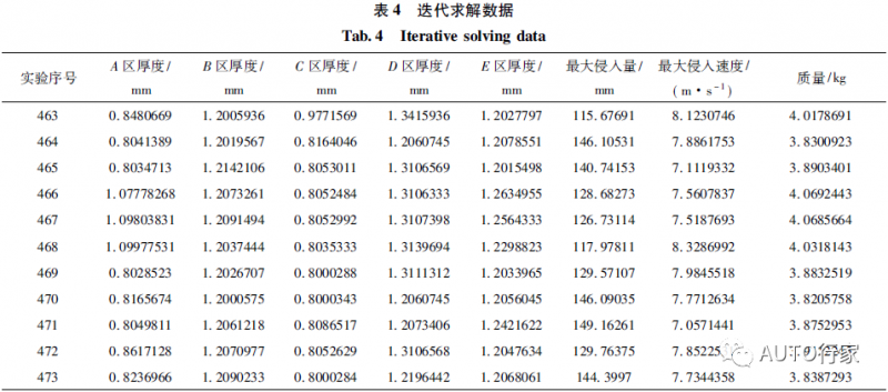 式中: ymax为丈量点最大侵入量; m 为B 柱表里板的总质料; vmax为丈量点最大侵入速率; t1 和t2 分手为A 区与C 区厚度; T1、T2 和T3 分手为B 区、D区和E 区厚度。正在给定的抑制要求下举行迭代,获得最优解。个别迭代数据如表4 所示。