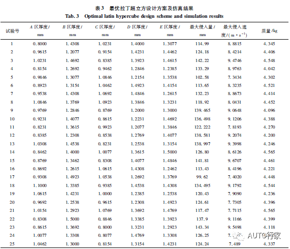 由最优拉丁超立方打算手腕举行抽样40 组数据举行仿线 能够昭彰看出B 柱表里板中A 和C 区域的变形较小,B、D 和E 区域变形较大,为闭键受碰撞区域,以是正在抽样前将A和C的成分程度节制正在相对较低的程度,B、D 和E 则节制正在相对较高的程度,以合适实质需求。