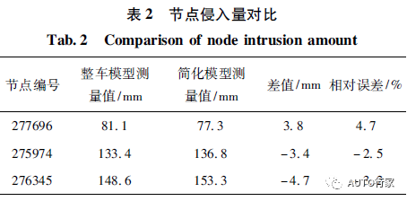 筑模已毕后,将简化模子举行计较,输出计较结果与整车模子举行较量,以此验证简化模子的牢靠性。遵照B 柱上对应乘员头部、胸部和盆骨的枢纽丈量节点举行最大侵入量的输出并与整车碰撞模子上对应的节点最大侵入量举行比照。枢纽节点编号次第为节点277696、节点275974 和节点276345,分手对应于驾驶员头、胸和盆骨的职位,侵入量数据如表2 所示。