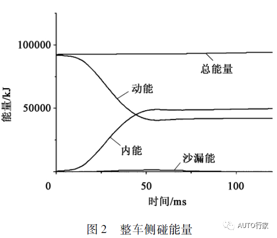整车碰撞模子能量输出图如图2 所示。正在碰撞历程中,碰撞模子体例初始能量为9. 29 × 104 kJ。通过阐述结果显示,沙漏能为0. 07 × 104 kJ,占总能量的0. 75%,沙漏能极小,正在合理规模以内,体例初始能量与表面能量根基仍旧类似,且各个能量蜕变趋向合理,归纳得出此整车碰撞模子的结果具有较高的牢靠性。