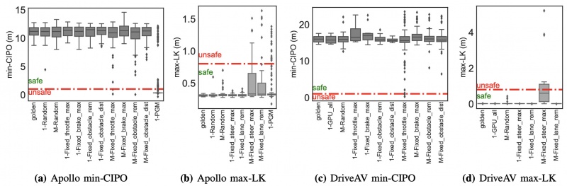 通过对发掘出的合头阻滞举行检测,展现最容易发作车辆碰撞事变的ADS模块输出前3位分离是骨气门值(561个合头阻滞中的24%)、PID担任器输入(18%)和传感器交融困穷类值(15%)。Bayesian FI用于创修违反车道的主意的ADS模块输出是:(a)车道类型值(2%)、(b)油门(1.4%)、(c)转向(1.4%)。56%的阻滞类型从未被Bayesian FI利用过;比方Bayesian FI从未注入到相机传感器对象分类模块的输出中。