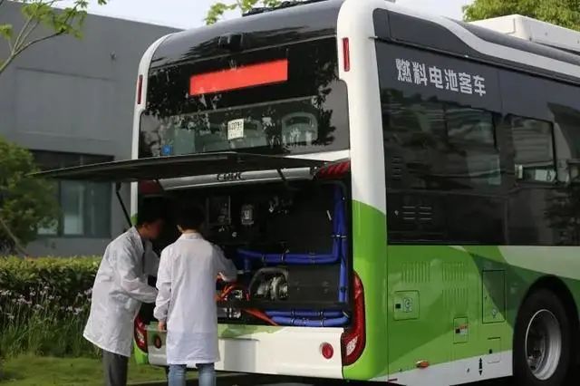 他先容,公交的动力起原,就来自藏正在车顶的6个储氢瓶内。行驶时,氢气和氧气正在车尾的燃料电池内发作电化学响应,爆发电能驱动车辆,经过中独一的排放物是水,从而完毕了