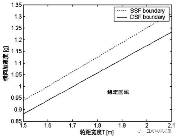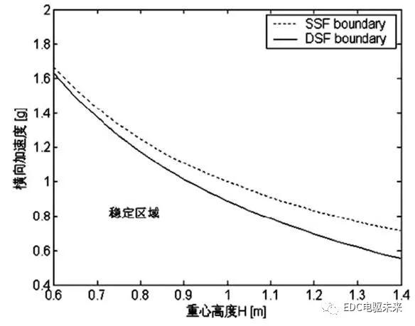 )和动态身分两一面,且动态身分一面(含负号)老是小于零,即动态平静性老是比静态平静性差。从式10可睹,重心高度是影响DSF动、静两部份的枢纽参数,H越大,DSF越小,即车辆平静性越差。随后,文中还对重心高度和轮距对汽车侧翻平静区域的影响举行了分解(如图2、图3)[9];得出结论:“跟着重心高度添补,横向加快率极限值减小,但由动态平静因子获得汽车侧翻横向加快率极限值跟着重心高度减小的更速,即受重心高度变更的影响更大……由动态平静因子和静态平静因子获得汽车侧翻横向加快率极限值受轮距宽度的影响水准是同等的。因而,由动态平静因子界说可知,正在汽车安排中普及汽车侧翻平静性时,妥贴的减小汽车重心高度比同比增大轮距宽度的手段更有用。而遵照静态平静因子界说同比减小重心高度或增大轮距宽度对刷新汽车防侧翻平静性效率不异。”[9]