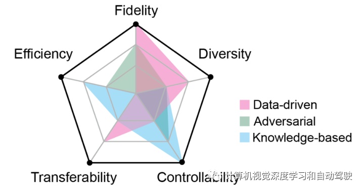 如图是三种和平-紧要场景天生法子的阐述。(a) 数据驱动法子仅用网罗的数据直接或通过天生模子实行采样。(b) 顽抗性法子行使来自仿真安置中的自愿车辆反应。(c) 基于常识的法子合键运用来自外部常识的音讯举动天生的桎梏或向导。