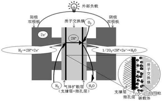 质子互换膜燃料电池(Proton Exchange Membrane Fuel Cell,PEMFC),图2为其就业道理示企图。