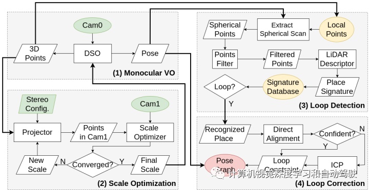 8 “Fast Direct Stereo Visual SLAM“, arXiv,December,2021作家来自美国明尼苏达大学。本文提出一种不依赖于特点检测和成家的火速、确切的立体视觉SLAM本事,DSV(direct-stereo-vision)-SLAM。将单目DSO(Direct Sparse Odometry)本事扩展到立体视觉体系,通过优化3D点标准来最小化立体视觉的光度(photometric)差错;与古代的立体成家比拟,这是一种盘算出力高且鲁棒的本事。进一步扩展到有闭环的全体SLAM体系,省略累积差错。正在假设摄像机向前运动的景况下,从视觉里程计得回3D点,模仿激光雷达扫描,用激光雷达点云刻画子举办处所识别,更有用地检测闭环。然后,用直接对齐法(direct alignment)推测相对状貌,最小化潜正在闭环的光度差错。可选地是,用ICP(Iterative Closest Point)算法对直接对齐本事进一步矫正。结尾,优化一个pose graph,普及全体SLAM精度。由于避免SLAM体系的特点检测或成家,确保较高的盘算出力和鲁棒性。对大家数据集的彻底测验,验证阐明其有用性。代码开源:IRVLab/direct_stereo_slam如图是该本事DSV-SLAM的概览:将标准优化和基于激光雷达刻画子的处所识别本事联结到直接立体视觉SLAM体系中,(1) 从Cam0下手,单目VO推测摄像机状貌并天生3D点;(2) Scale Optimization模块用3D点推测并连结VO标准;(3) 闭环检测(loop closure detection)模块基于VO的3D点检测闭环;(4) 看待潜正在闭环,Loop Correction模块推测闭环的相对状貌,并全体性优化状貌。