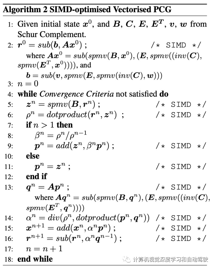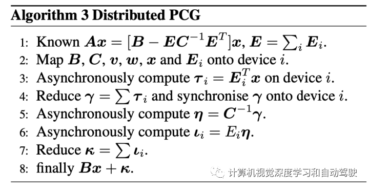 正在高层看,MegBA散布式BA算法有两个合键构成部门:(i)一种能够将BA题目划分为子题目的本事,这些子题目能够由并行矢量化PCG处理;(ii)一种能够同步并行PCG状况的算法,以便能够协同处理原始全体BA题目。distributed PCG算法如下所示: