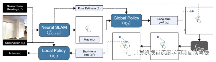 这里全体筹划器采用巩固的以智体为核心的局限舆图行为输入,征求指示已探测区域、未探测区域及报复和史籍轨迹的通道,从历久倾向坐标的两个高斯散布中输出两个实数。该全体筹划器被参数化为CNN战术,并通过PPO算法举办练习。而局限筹划器正在智体为核心的局限舆图履行经典筹划,即FMM(Fast Marching Method)算法,完成给定的历久倾向,并输出短期子倾向的轨迹。结尾,局限战术天生给定RGB图像和子倾向的手脚,并通过师法练习举办练习。如图是ANS中Neural SLAM架构:该模块通过监视练习举办练习,以RGB图像、状貌感知信号及其过去的输出行为输入,并输出更新的2D重修舆图和现时状貌推测。