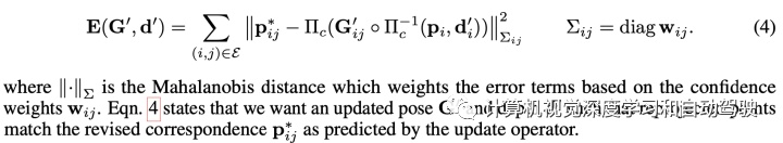 合连特点供应了相合致密流域每个像素处所左近视觉好像性的新闻,使收集可能练习对齐视觉好像的图像区域。然而,对应合联有时是含糊其词的。该流供应了一个互补新闻源,允诺收集诈欺体育场中的滑腻度来得回鲁棒性。合连特点和流特点正在注入GRU之前离别通过两个卷积层举办照射。另外,通过逐元加操作将上下文收集提取的上下文特点注入GRU。ConvGRU是一个小感想野的局限操作。沿着空间维做隐均匀,提取全体上下文,并将此特点向量用作GRU的特别输入。全体上下文正在 SLAM 中很紧要,由于不确切的对应合联(比方由大型挪动倾向惹起)会低落体系简直切性。对收集来说,识别和拒绝缺点对应出格紧要。DBA层把流更正集照射成状貌集,并逐元深度更新。如下界说本钱函数: