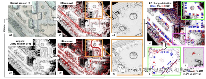 sed lifelong mapping)。它将题目划分为序贯子题目:众节SLAM(multi-session SLAM,MSS)、高/低动态变动检测和正/负变动管束。该本事诈欺MSS,管束潜正在的轨迹差错;因而,变动检测不须要优良的初始校准。这个变动管束计划正在内存和盘算本钱方面连结有用性,供应了大界限点云舆图自愿别离倾向的效力。通过对众个光阴间隔(从一天到一年)的多量实践测验,验证了该框架的牢靠性和实用性。