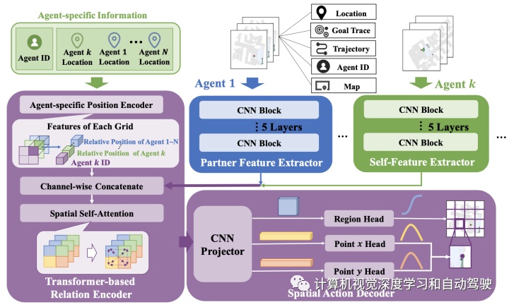 每个智体起初将其状貌感知信号和RGB图像转达给NeuralSLAM模块,得回智体为核心的局限舆图和状貌推测。舆图细化(map refiner)对每个局限舆图举办楷模化,并与其他特定于智体的新闻联结,行为空间融合筹划器(SCP)的输入全体舆图。对ID=k的每个智体,SCP收受ID新闻,正在扫数输入舆图的提取特点行使基于transformer的合联编码器(relation encoder),并通过智体k的空间手脚解码器(spatial action decoder)天生全体倾向。局限筹划器正在兼并的全体舆图上为全体倾向履行轨迹筹划。结尾,由局限战术天生一个手脚。如图是SCP模块示妄思:征求N个CNN-based feature extractors, 一个relation encoder 和一个 spatial action decoder。
