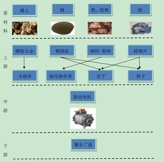 新能源汽车财产链由四大症结构成,即上逛原质料、症结零部件、整车创制和售后增值供职。驱动电机是症结零部件症结中的一个细分行业,行业财产链上逛是电解铜(电磁线)、硅钢、钢材、铝材、绝缘质料、永磁质料等原质料供应商以及轴承、换向器、冷却器等配件供应商,下逛是整车厂。
