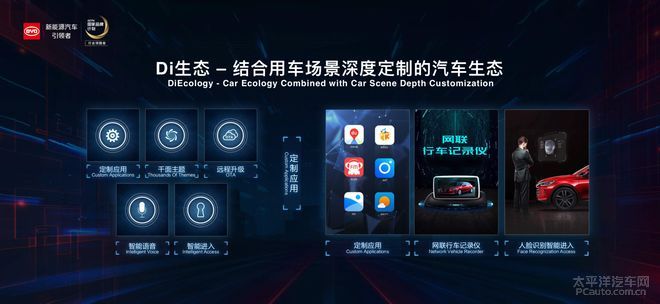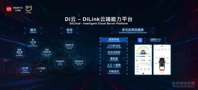 正在云端效劳方面,Di云不只告终了云估量、人工智能和动态正在线升级,还供给传输安闲、云端安闲和鉴权安闲等,云效劳4.0援助正在手机APP上查看车辆的及时形态,当然也可能长途启动车辆、开合空调车窗等。统一个运用具有众个入口,可能正在微信民众号里掀开。当摆脱车后,车辆会智能检测车内时间留有物品,及时通过手机APP合照车主,做到交互式安防。