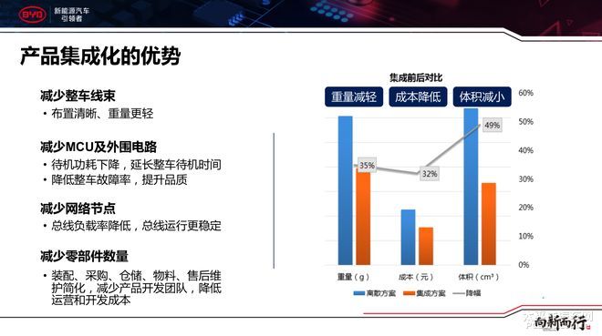 近年来,跟着修设的增众,车上的电子修立也随之变众,各个编制的交互新闻广大,散布式的EEA曾经无法满意这么宏壮的新闻交互了,因此集成式EEA则应运而生,活泼的收集拓扑、巨额省略编制交互的新闻量、低落总线负载率。比拟分立式左右器构造,高度集成后的重量减轻35%、体积减小49%、本钱低落32%。