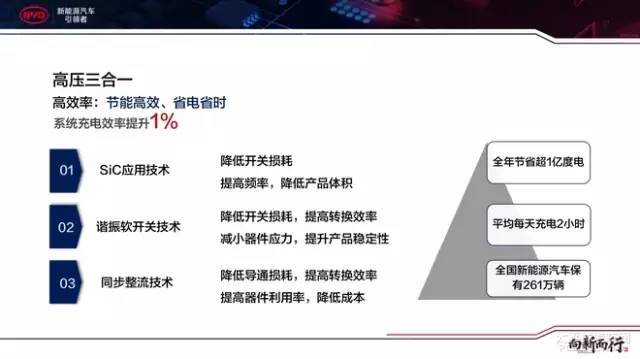 利用SiC运用本领、谐振软开合本领和同步整流本领等,似的编制充电效果擢升1%。不要小看这1%,根据现正在寰宇新能源车261万辆的保有量来估量,均匀每天充电2小时,那么整年就能节流赶上1亿度电。