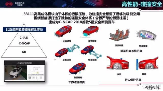 比亚迪新能源具有一套己方的碰撞安闲系统,这一套系统高于C-IASI、C-NCAP和国家圭臬,最直接的表示即是比亚迪唐新能源成为C-NCAP 2018首款5星安闲新能源车。比亚迪新能源碰撞安闲系统碰撞试验项目比C-NCAP的要众,除了100%重叠率的正面碰撞和40%重叠率的正面偏置碰撞等外,尚有侧面柱碰、行人头部爱戴和行人腿部爱戴等项目。可能说是以一个高于行业圭臬的形态而存正在着。