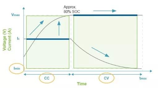 该图显示了由两个阶段构成的锂离子电池的浅易古代充电算法:恒流和恒压.正在恒定电流阶段,电池最先将充电器视为电流源,正在这个阶段,电池的充电电流越高,电压升高的速率就越速。这个结果显示了电池抵达80%电量所需求的时辰。正在以下恒定电压阶段中,电流徐徐低浸,电池复原洪量电量,一朝电流抵达界说的最低程度,充电将中止。