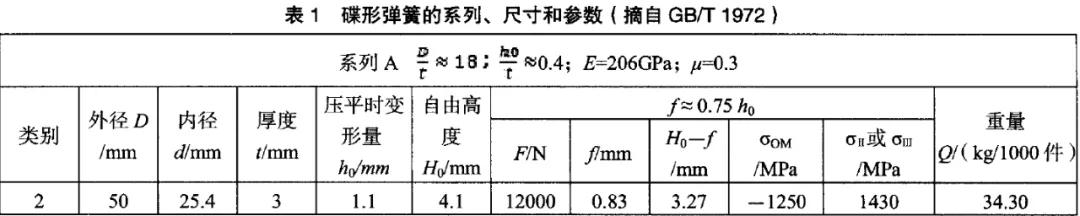 碟形弹簧按其布局局势分为无撑持面和有撑持面两种(本文所指特种车采用无撑持面的碟形弹簧),按其厚度分为三类,按其外径D、压寻常变形量h0和厚度t的比值D/t、h0/t分为三个系列。表1列出了正在该型特种车上采用的碟形弹簧的身手数据。