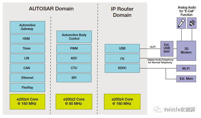 一个IP域:相接至互联网,用于援助众种使用,比如正在车载搜集平分布场内下载,运用专用e200z4内核、专用体系RAM和一局限闪存阵列,运转其本身的操作体系(OS),此体系具有其本身的OS计时器、看门狗和体系资源。