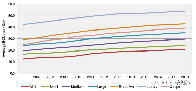 目前的汽车有众达几十以至上百个电子统制单位并相接到众个总线上,Strategy Analytics的数据预测了各级别汽车统制器数目的扩张趋向。均匀来说,目前的汽车大约采用25个ECU,但少少高端车型一经采用逾越100个ECU。他日若仍旧采用这种分散式E/E架构,会导致一个范畴更大且丰富的车载搜集和布线,另一方面也将影响整车的轻量化。