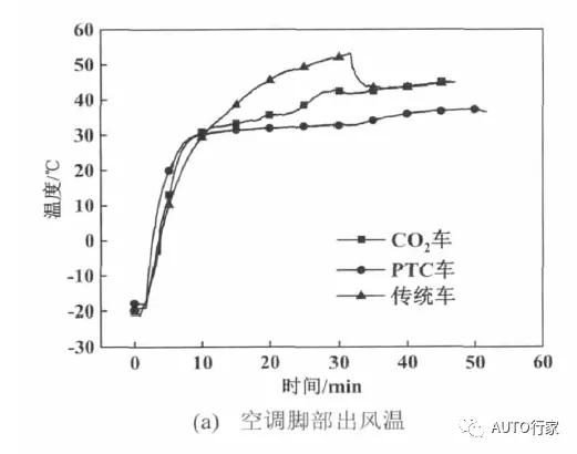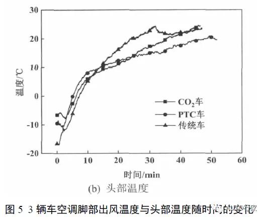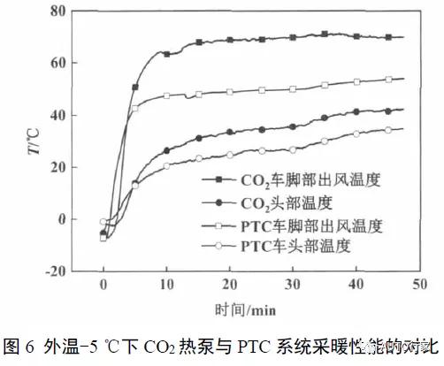 图6所示为正在室外温度-5℃下,CO2热泵与PTC体例采暖本能的比照。正在测验发端45min后,CO2热泵车和PT车的脚部出风温度判袂为69.6℃和54.8℃,头部温度判袂为41.4℃和33.2℃。于是正在室外温度-5℃下,CO2热泵体例采暖才气仍明显优于PTC体例。