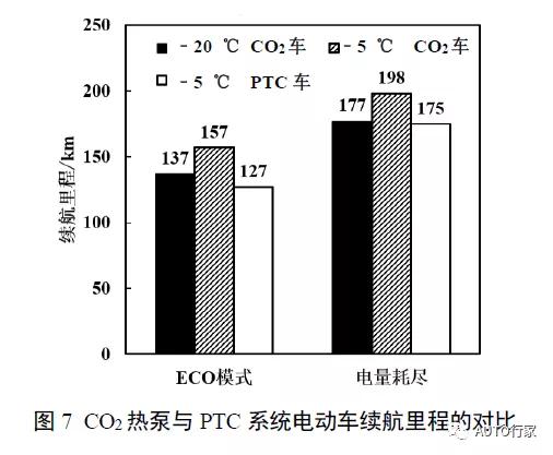 图7所示为CO2热泵体例与PTC体例电动车的续航里程比照测验结果。正在室外温度为﹣5℃下,两车判袂能手驶157km和127km落后入ECO形式,能手驶198km和175km后电量耗尽。可睹CO2热泵体例为车辆正在平常形式下补充了23.6%行驶里程,约30km,全程共补充续航里程23km。因为正在ECO形式下制热量低落,而热泵体例的COP大于PTC体例,于是朴实的能源比拟平常形式会省略。研商到乘员舱安适性条件,评判车辆平常形式