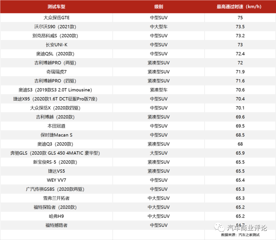 依据汽车之家的测试数据,凡是的家用轿车麋鹿测试功效能抵达74km/h以上,就算相当不错了,而重心较高的SUV,功效正在68km/h以上,就算合格了。