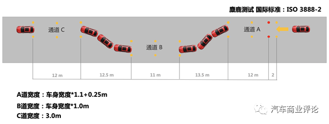 以ISO 3888-2圭表为例,麋鹿测试时要把桩筒按必定隔断摆放出S型的车道,测试赛道总长63m,有三个通道,A道长12m,宽度为车身宽度×1.1+0.5m;A道到B道之间的弯道长13.5m;B道长11m,宽度为车身宽度+1.1m;B道到C道之间的弯道长12.5m;C道长12m,宽度为3.0m。
