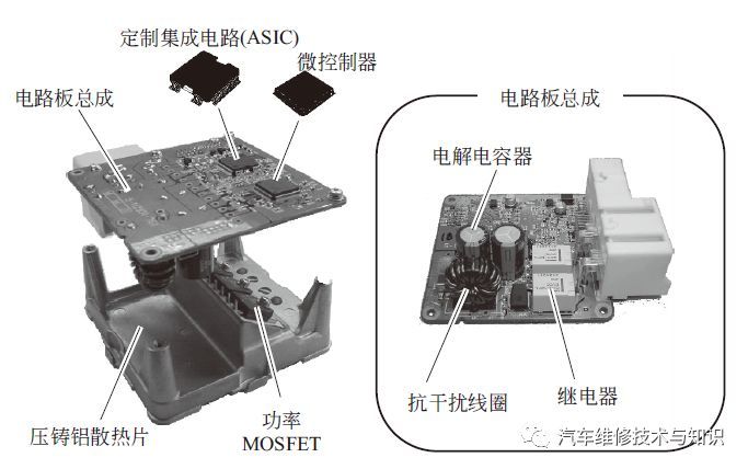 EPS ECU由用于局限的微局限器、用于监测的集成电途(有时为微局限器)、电机的驱动电途(驱动电途和转换电途)、通断电机途径及电源途径的继电器、接受外部信号的接口电途等组成。电机驱动电途的效力是对功率元件MOSFET实行通断的PWM局限。