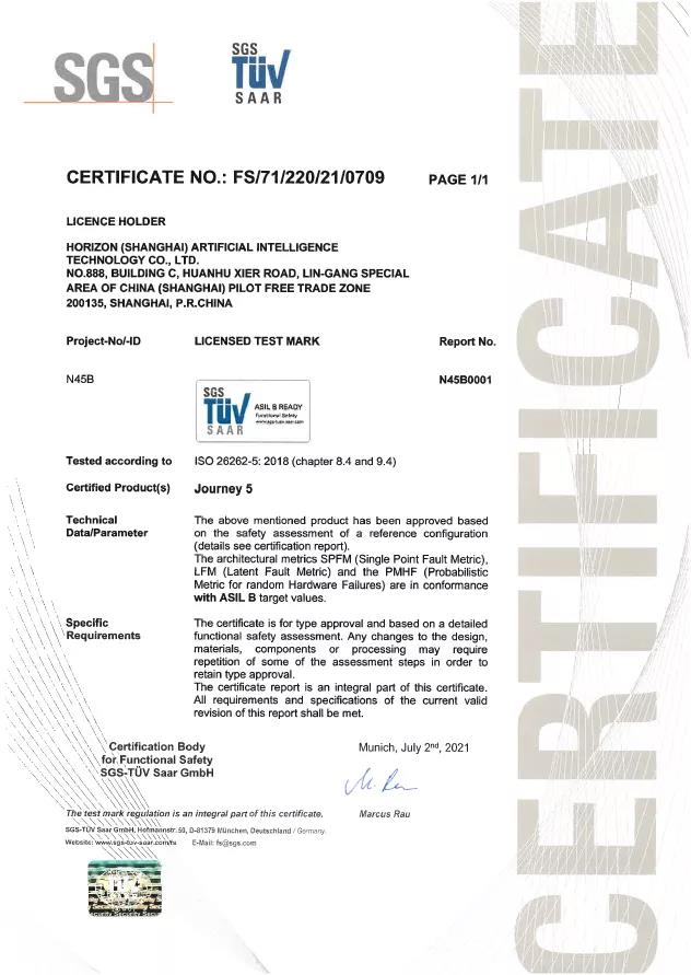 地平线日,地平线芯片凯旋通过SGS-TÜV ISO 26262 ASIL-B Ready性能安适产物认证。环球出名的考验、审定、测试和认证机构SGS TÜV Saar(环球性能安适技巧中央)向地平线宣告证书。