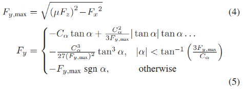 前后轮胎上的横向力用轮胎刷子模子近似。该模子表征了侧向力与侧偏角α,轮胎目标与其速率矢量之间夹角的函数闭连。准备公式如下: