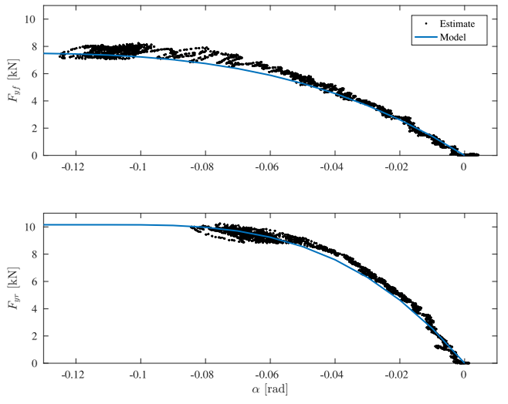 轮胎参数通过斜坡相应确定,此中车辆以恒定的速率ux行驶,δ以固定的速度舒徐延长,辨识结果如图2所示。