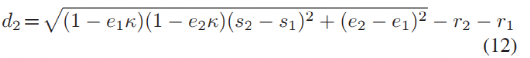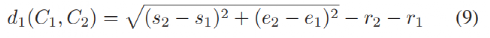 看待肆意的两个圆C1和C2,差别由其正在弧线坐标系中的处所和半径举办参数化,即(s1、e1、r1)和(s2、e2、r2),弧线坐标系中的有符号隔断为: