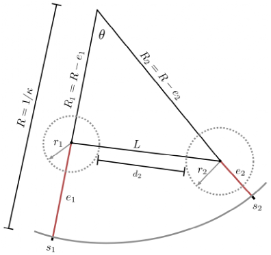 当曲率为零或两个圆同时位于参考线上时,两者之间的隔断即是圆心隔断d1,而且跟着这些参数变更而光滑变更。固然 d1 可表现有符号隔断,但它会因