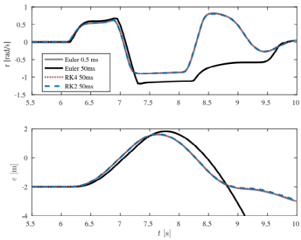 图5显示了对输入轨迹 以及给定车辆模子(8)与车辆状况r和e的差异积分器举办积分的结果。输入轨迹来自危殆车道变换,这代表激烈的车辆操作,由于状况导数幅值较大而且状况正在相当长的时分内处于轮胎模子的饱和区域。步长为h=0.5 ms的欧拉步骤行动基线 ms 的欧拉步骤出格不切实,而看待不异的步长,RK2 发扬出格好。其余,看待此模子,RK2 的职能与 RK4 一律好,但准备量清楚节减。因为这些起因,本文拔取 RK2 行动离散化步骤。