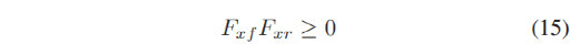 ,这是摩擦圆管束。横向轮胎模子强制奉行此管束以局部给定纵向力下的横向力巨细,但还需求管束纵向力。操纵(17)准备的Fxf和Fxr都受到由(7)准备取得的