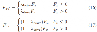 另一种变量拔取是总纵向力 Fx 和制动分拨λbrake。制动分拨表现应将总纵向力怎样分拨给前轴和后轴。给定Fx、λbrake和固定驱动散布λdrive,能够准备Fxf 和 Fxr: