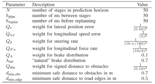 操纵器正在Ubuntu 16.04的古板机载准备机上运转,i7-6700 CPU 以 4.0 GHz 运转。转向角、每个轴上的制动力(照射到制动压力)和驱动力(照射到扭矩)指令被转达到及时准备机以举办基层操纵。拔取本钱函数权重,如表 I所示,将每项目标的合理值同一缩放。比方,50cm的横向处所偏差、10 deg/s 的转向速度以及位于妨碍物最小安闲隔断10cm内的处所都对总本钱的进献值为 1。