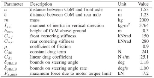 正在危殆情状下,操纵器需求疾速事务,充斥相识轮胎横向力和纵向力之间的须要量度,并操纵能够表征车辆转弯的车辆和妨碍物表现法。实行这一点所需的安排计划,异常是正在试验车辆上,是本文的进献。本文提出了一个NMPC操纵器来准备车辆转向角和前后轮纵向力。采用单轨动力学模子和刷子轮胎模子创造车辆动力学模子,同时推敲稳态时纵向质料的蜕变和由纵向力所惹起的横向力变更。避障通过一种新鲜的表现步骤举办治理,该步骤将车辆和妨碍物用一组圆表现,并准备统统车辆和妨碍物圆对之间的有符号隔断。通过拔取总的纵向力和制动差错行动优化变量,节减了待求题目的庞大性,同时仍使操纵器可能正在前后轴之间肆意操纵制动力。所创造的公式使得操纵器可能足够疾地及时运转,每50毫秒从新规同等次,而且足够庞大地正在车辆极限下事务,正在一个或众个轮胎一律饱和的情状下调和横向和纵向力。第二节形容了所拔取的车辆模子,第三节说明了车辆和妨碍物的表现,第四节形容了优化题目的表述。第五节斗劲了操纵差异车辆和妨碍物表现时操纵器的求解时分,并说明了操纵器正在全尺寸车辆上的有用性,通过一个足够绝顶的工况说明所选模子的庞大性。正在尝试结果中,两个妨碍物“弹出”到车辆前面,迫使车辆奉行危殆车道切换。操纵器调和各轴的制动力和转向力,同时告捷避开妨碍物。