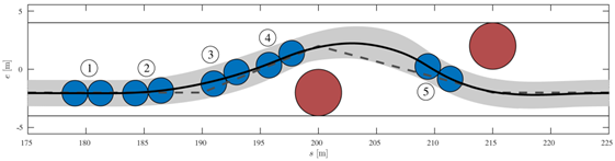 正在本次尝试中,测试车辆正在直线道道上行驶,坚持正在车道中心。正在车辆的质心通过s=180后(图8中的时分①),展示了两个妨碍物:一个此刻车道的s=200处,另一个正在 对向车道的s=215处。此时,车辆开端危殆变道。时分①-⑤正在图9、10、11和12顶用灰色虚线显示了车辆正在时分①-⑤处的俯视图。